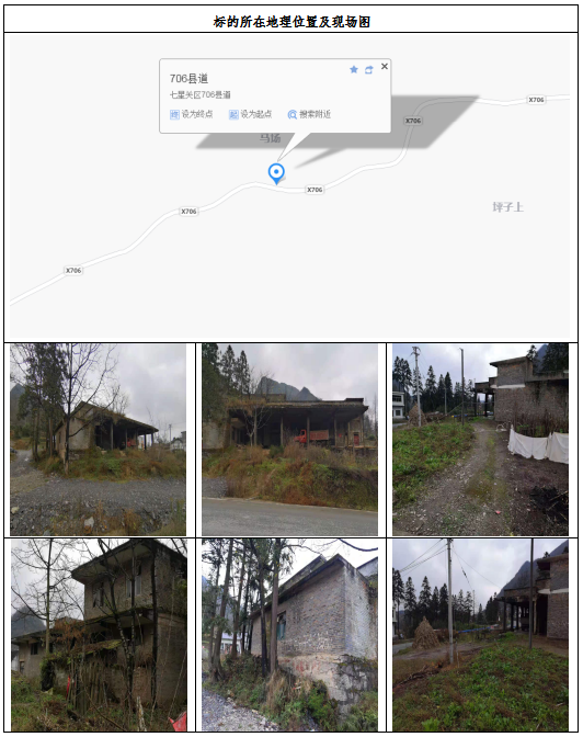 標(biāo)的位于畢節(jié)市七星關(guān)區(qū)燕子口鎮(zhèn)峨峰溝村陸家灣組,房屋總層數(shù)二層,建成于1990年。房屋租賃期限:2018年7月1日至2021年7月1日。總建筑面積:454.34㎡,其中套內(nèi)建筑面積:392.7㎡,共有分?jǐn)偯娣e:61.64㎡;土地面積:282.49㎡,磚混結(jié)構(gòu),無房產(chǎn)證,國有土地使用證:畢市國用(95)字第24021號,用途為:商業(yè)用地,土地性質(zhì)為:劃撥用地。