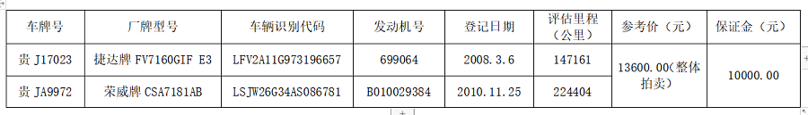 一、拍賣標的:貴J17023、貴JA9972機動車各一輛。