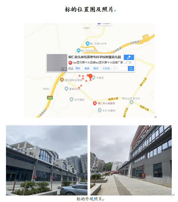 標(biāo)的位于銅仁幼兒師范高等??茖W(xué)校附屬幼兒園,所在樓棟均為商業(yè)樓,房屋總層數(shù)為3層,標(biāo)的位于該樓棟的第1層,為步梯房,總建筑面積為659.82平方米,框架結(jié)構(gòu),層高約3.5米-4.5米,用途為商業(yè)用房,目前均處于空置狀態(tài),建成于2019年。