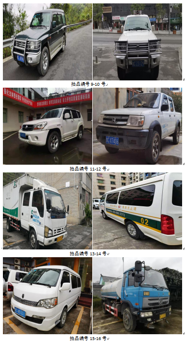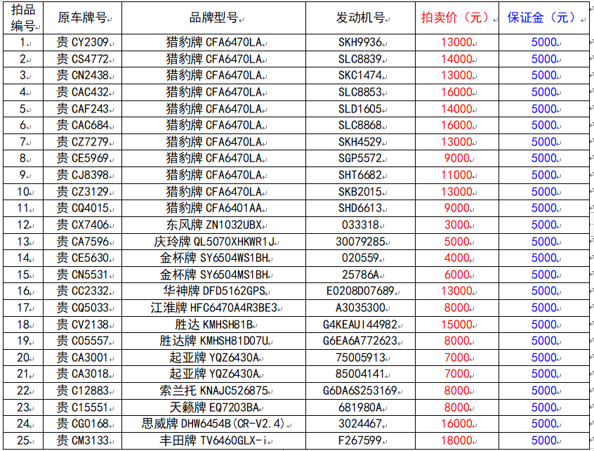 獵豹牌11輛、東風(fēng)牌車輛1輛、慶玲牌1輛、金杯牌2輛、華神牌1輛、江淮牌1輛、勝達牌2輛、起亞牌2輛、索蘭托1輛、天籟牌1輛、思威牌1輛、豐田牌1輛,共計25輛。展樣、報名時間(保證金):2021年11月4日至2021年11月10日(上午9:00至下午17:00,以保證金到賬時間為準(zhǔn)。)